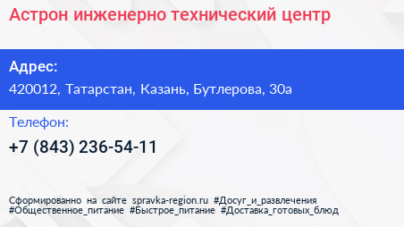 Астрон, инженерно-технический центр по адресу 420012, Татарстан, Казань, Бутлерова, 30а в дальнейшем Организация, размещена в следующих категориях: