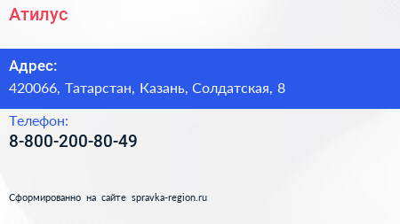 Атилус по адресу 420066, Татарстан, Казань, Солдатская, 8 в дальнейшем Организация, размещена в следующих категориях: