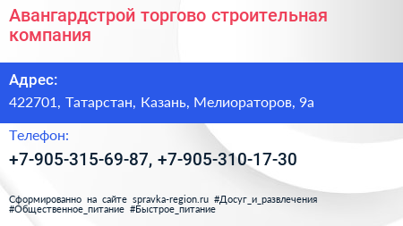 Авангардстрой, торгово-строительная компания по адресу 422701, Татарстан, Казань, Мелиораторов, 9а в дальнейшем Организация, размещена в следующих категориях: