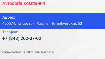 Avtodoria, компания по адресу 420074, Татарстан, Казань, Петербургская, 52 в дальнейшем Организация, размещена в следующих категориях: