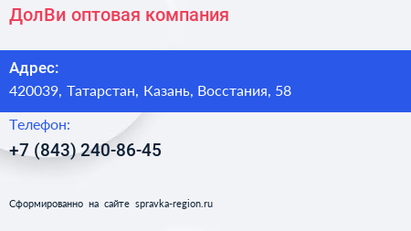 ДолВи, оптовая компания по адресу 420039, Татарстан, Казань, Восстания, 58 в дальнейшем Организация, размещена в следующих категориях: