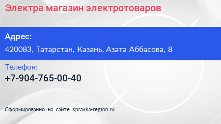 Электра, магазин электротоваров по адресу 420083, Татарстан, Казань, Азата Аббасова, 8 в дальнейшем Организация, размещена в следующих категориях: