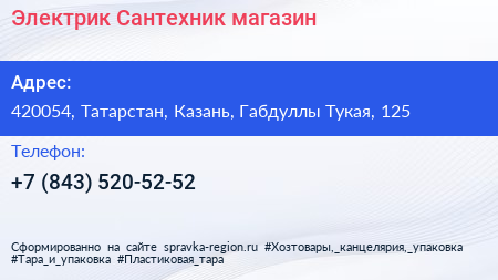 Электрик & Сантехник, магазин по адресу 420054, Татарстан, Казань, Габдуллы Тукая, 125 в дальнейшем Организация, размещена в следующих категориях: