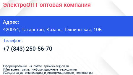 ЭлектроОПТ, оптовая компания по адресу 420054, Татарстан, Казань, Техническая, 10Б в дальнейшем Организация, размещена в следующих категориях: