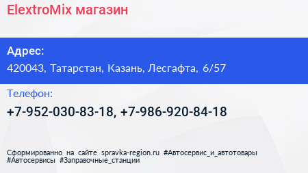 ElextroMix, магазин по адресу 420043, Татарстан, Казань, Лесгафта, 6/57 в дальнейшем Организация, размещена в следующих категориях: