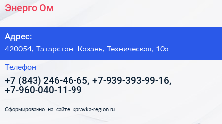 Энерго-Ом по адресу 420054, Татарстан, Казань, Техническая, 10а в дальнейшем Организация, размещена в следующих категориях: