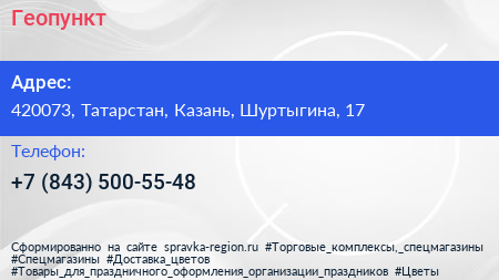 Геопункт по адресу 420073, Татарстан, Казань, Шуртыгина, 17 в дальнейшем Организация, размещена в следующих категориях:
