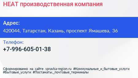 HEAT, производственная компания по адресу 420044, Татарстан, Казань, проспект Ямашева, 36 в дальнейшем Организация, размещена в следующих категориях: