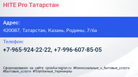 HITE Pro Татарстан по адресу 420087, Татарстан, Казань, Родины, 7/6а в дальнейшем Организация, размещена в следующих категориях: