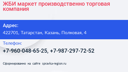 ЖБИ-маркет, производственно-торговая компания по адресу 422701, Татарстан, Казань, Полковая, 4 в дальнейшем Организация, размещена в следующих категориях: