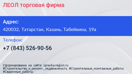 ЛЕОЛ, торговая фирма по адресу 420032, Татарстан, Казань, Табейкина, 19а в дальнейшем Организация, размещена в следующих категориях:
