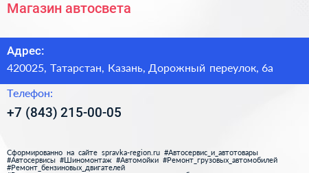 Магазин автосвета по адресу 420025, Татарстан, Казань, Дорожный переулок, 6а в дальнейшем Организация, размещена в следующих категориях: