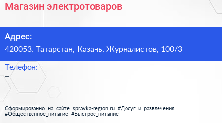 Магазин электротоваров по адресу 420053, Татарстан, Казань, Журналистов, 100/3 в дальнейшем Организация, размещена в следующих категориях: