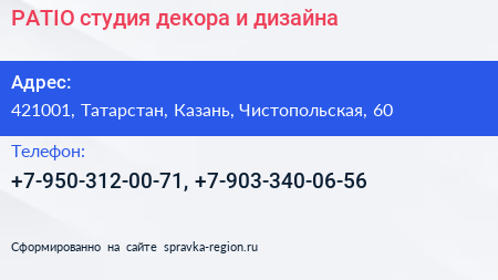 PATIO, студия декора и дизайна по адресу 421001, Татарстан, Казань, Чистопольская, 60 в дальнейшем Организация, размещена в следующих категориях: