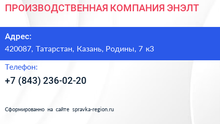 ПРОИЗВОДСТВЕННАЯ КОМПАНИЯ ЭНЭЛТ по адресу 420087, Татарстан, Казань, Родины, 7 к3 в дальнейшем Организация, размещена в следующих категориях: