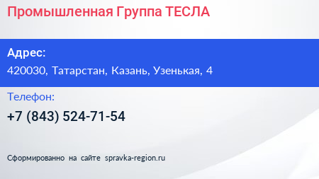 Промышленная Группа ТЕСЛА по адресу 420030, Татарстан, Казань, Узенькая, 4 в дальнейшем Организация, размещена в следующих категориях: