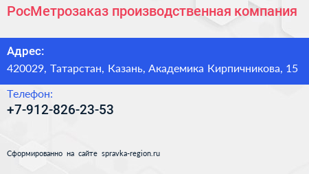 РосМетрозаказ, производственная компания по адресу 420029, Татарстан, Казань, Академика Кирпичникова, 15 в дальнейшем Организация, размещена в следующих категориях: