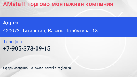 AMstaff, торгово-монтажная компания по адресу 420073, Татарстан, Казань, Толбухина, 13 в дальнейшем Организация, размещена в следующих категориях: