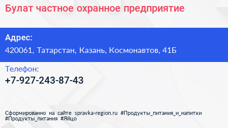 Булат, частное охранное предприятие по адресу 420061, Татарстан, Казань, Космонавтов, 41Б в дальнейшем Организация, размещена в следующих категориях: