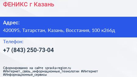 ФЕНИКС, г. Казань по адресу 420095, Татарстан, Казань, Восстания, 100 к266д в дальнейшем Организация, размещена в следующих категориях: