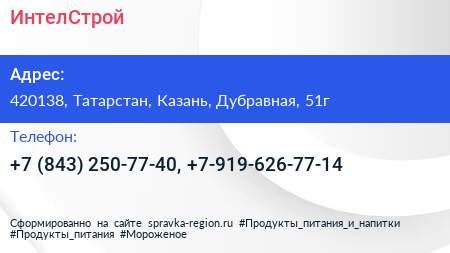 ИнтелСтрой по адресу 420138, Татарстан, Казань, Дубравная, 51г в дальнейшем Организация, размещена в следующих категориях: