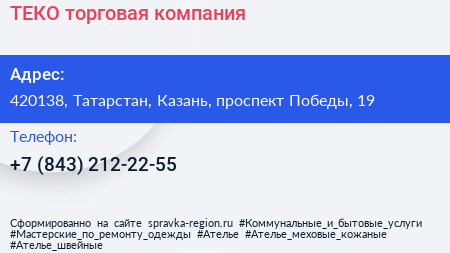ТЕКО, торговая компания по адресу 420138, Татарстан, Казань, проспект Победы, 19 в дальнейшем Организация, размещена в следующих категориях: