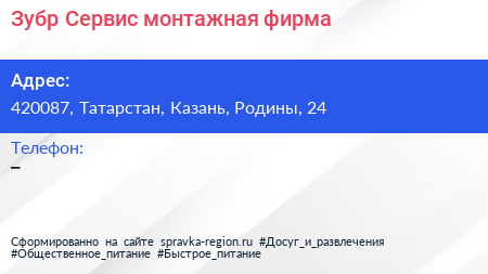Зубр-Сервис, монтажная фирма по адресу 420087, Татарстан, Казань, Родины, 24 в дальнейшем Организация, размещена в следующих категориях: