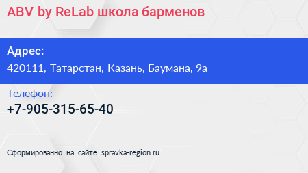 ABV by ReLab, школа барменов по адресу 420111, Татарстан, Казань, Баумана, 9а в дальнейшем Организация, размещена в следующих категориях: