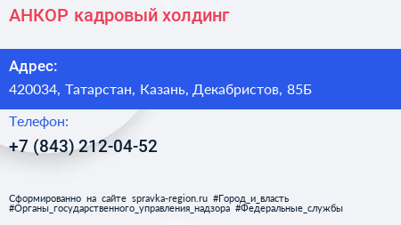 АНКОР, кадровый холдинг по адресу 420034, Татарстан, Казань, Декабристов, 85Б в дальнейшем Организация, размещена в следующих категориях: