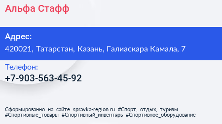 Альфа-Стафф по адресу 420021, Татарстан, Казань, Галиаскара Камала, 7 в дальнейшем Организация, размещена в следующих категориях:
