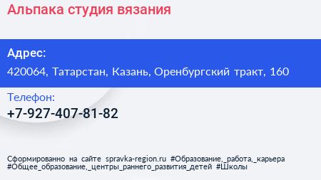 Альпака, студия вязания по адресу 420064, Татарстан, Казань, Оренбургский тракт, 160 в дальнейшем Организация, размещена в следующих категориях: