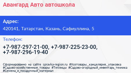 Авангард-Авто, автошкола по адресу 420141, Татарстан, Казань, Сафиуллина, 5 в дальнейшем Организация, размещена в следующих категориях: