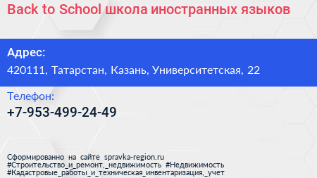 Back to School, школа иностранных языков по адресу 420111, Татарстан, Казань, Университетская, 22 в дальнейшем Организация, размещена в следующих категориях: