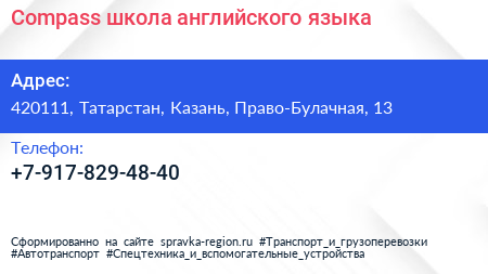 Compass, школа английского языка по адресу 420111, Татарстан, Казань, Право-Булачная, 13 в дальнейшем Организация, размещена в следующих категориях: