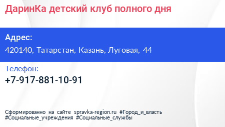 ДаринКа, детский клуб полного дня по адресу 420140, Татарстан, Казань, Луговая, 44 в дальнейшем Организация, размещена в следующих категориях: