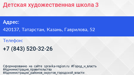 Детская художественная школа №3 по адресу 420137, Татарстан, Казань, Гаврилова, 52 в дальнейшем Организация, размещена в следующих категориях: