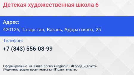 Детская художественная школа №6 по адресу 420126, Татарстан, Казань, Адоратского, 25 в дальнейшем Организация, размещена в следующих категориях: