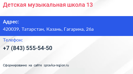 Детская музыкальная школа №13 по адресу 420039, Татарстан, Казань, Гагарина, 26а в дальнейшем Организация, размещена в следующих категориях: