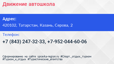 Движение, автошкола по адресу 420102, Татарстан, Казань, Серова, 2 в дальнейшем Организация, размещена в следующих категориях: