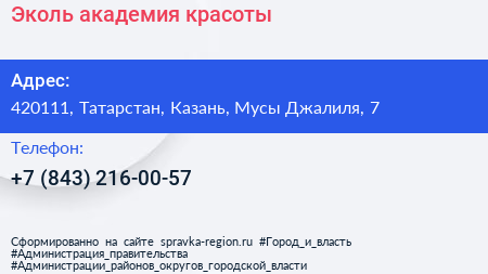 Эколь, академия красоты по адресу 420111, Татарстан, Казань, Мусы Джалиля, 7 в дальнейшем Организация, размещена в следующих категориях: