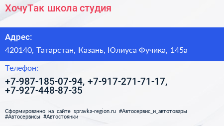 ХочуТак, школа-студия по адресу 420140, Татарстан, Казань, Юлиуса Фучика, 145а в дальнейшем Организация, размещена в следующих категориях: