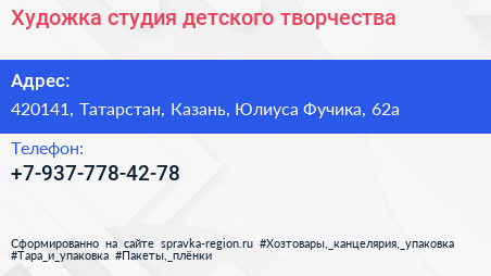Художка, студия детского творчества по адресу 420141, Татарстан, Казань, Юлиуса Фучика, 62а в дальнейшем Организация, размещена в следующих категориях:
