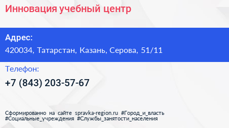 Инновация, учебный центр по адресу 420034, Татарстан, Казань, Серова, 51/11 в дальнейшем Организация, размещена в следующих категориях: