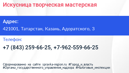 Искусница, творческая мастерская по адресу 421001, Татарстан, Казань, Адоратского, 3 в дальнейшем Организация, размещена в следующих категориях: