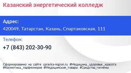 Казанский энергетический колледж по адресу 420049, Татарстан, Казань, Спартаковская, 111 в дальнейшем Организация, размещена в следующих категориях: