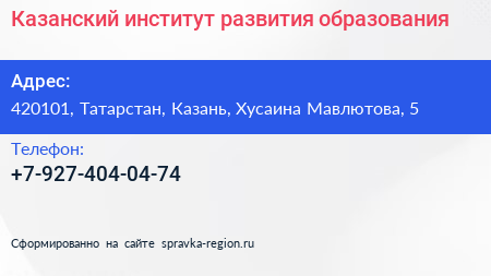 Казанский институт развития образования по адресу 420101, Татарстан, Казань, Хусаина Мавлютова, 5 в дальнейшем Организация, размещена в следующих категориях: