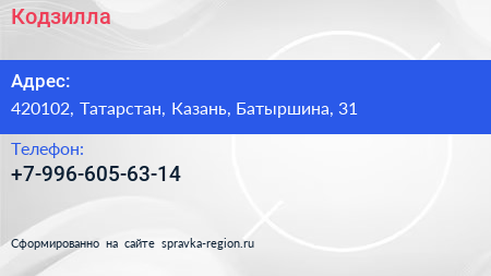 Кодзилла по адресу 420102, Татарстан, Казань, Батыршина, 31 в дальнейшем Организация, размещена в следующих категориях:
