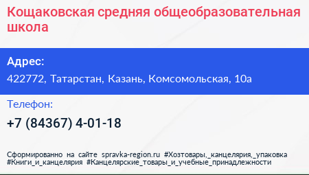 Кощаковская средняя общеобразовательная школа по адресу 422772, Татарстан, Казань, Комсомольская, 10а в дальнейшем Организация, размещена в следующих категориях: