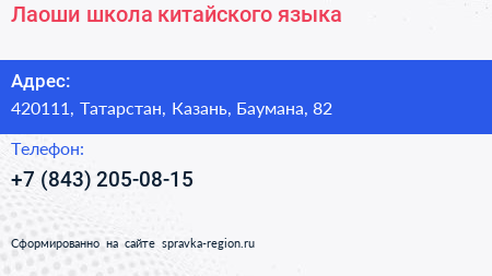Лаоши, школа китайского языка по адресу 420111, Татарстан, Казань, Баумана, 82 в дальнейшем Организация, размещена в следующих категориях: