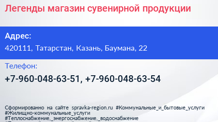 Легенды, магазин сувенирной продукции по адресу 420111, Татарстан, Казань, Баумана, 22 в дальнейшем Организация, размещена в следующих категориях: